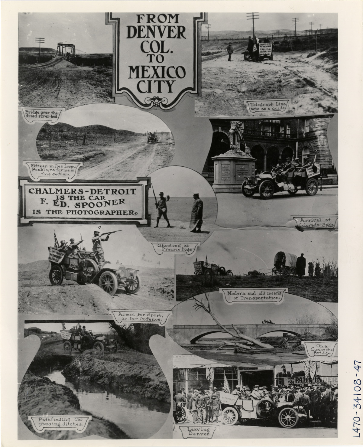 View of Chalmers-Detroit pathfinder car in Mexico and southwestern United States during the Flag-to-Flag Endurance Run from Denver to Mexico City. Printed on front: "From Denver Col. to Mexico City. Bridge over dried river-bed; telegraph line acts as a guide; fifteen miles from Peublo [sic], no farms in this section; shooting at prairie dogs, arrival at Colorado Springs; armed for sport or for defence; modern and old means of transportation, pathfinding car passing ditches; modern and old means of transportation; on a concrete bridge; leaving Denver. Chalmers-Detroit is the car, F. Ed. Spooner is the photographer." Handwritten on back: "Tours--Denver to Mexico City Endurance Run (Chalmers)."