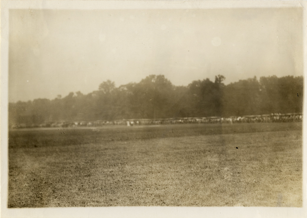 Distant view of row of cars during a 1911 trip for orphans to Belle Isle. The excursion was sponsored by the Wolverine Automobile Club. Handwritten on back: "Tours--Orphans Day outing, 1911, on Belle Isle."