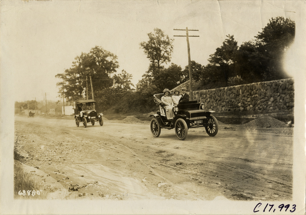 View of Mr. Omera and two women in Rauch & Lang electric car during the 1911 Electric Suburbaning Contest on Long Island, New York. Another car follows closely behind. Sponsored by the Electric Automobile Dealers' Association of New York City, the contest highlighted the advantages of the electric car for suburban use. Stamped on back: "Spooner & Wells, Inc., photographers, telephones 3472-3473 Columbus, 1931 Broadway, New York." Handwritten on back: "Mr. Omera. Tours--Electric Suburbaning Contest, 1911."
