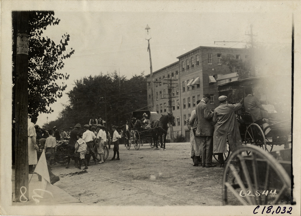 Horse-drawn carriages in street, 1910 Federation of American Motorcyclists Endurance Run