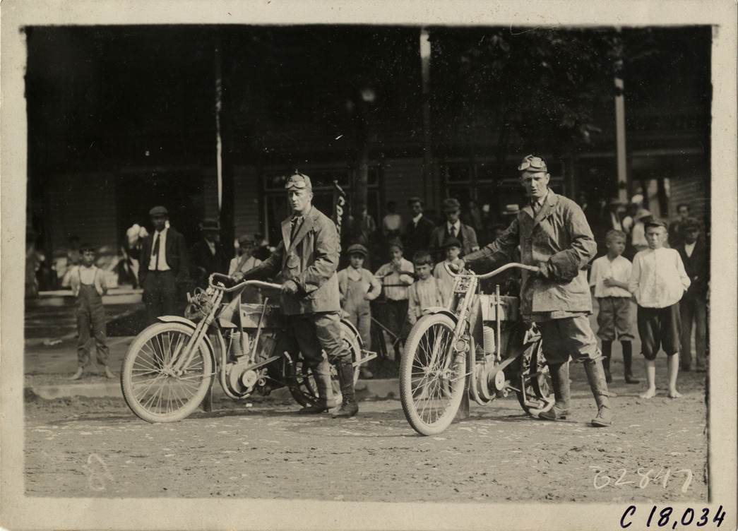View of two motorcyclists posing with motorcycles during the 1910 endurance and reliability run sponsored by the Federation of American Motorcyclists. Spectators in background. Contestants traveled through Pennsylvania, New York and New Jersey. Stamped on back: "Spooner & Wells, Inc., photographers, telephones 3472-3473 Columbus, 1931 Broadway, New York." Handwritten on back: "Tours--Federation of American Motorcyclists Endurance Run, 1910."
