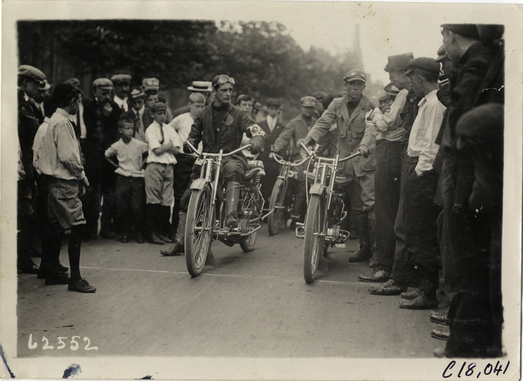View of motorcyclists standing with motorcycles at starting line during the 1910 endurance and reliability run sponsored by the Federation of American Motorcyclists. Spectators and officials stand on sidelines. Contestants traveled through Pennsylvania, New York and New Jersey. Stamped on back: "Spooner & Wells, Inc., photographers, telephones 3472-3473 Columbus, 1931 Broadway, New York." Handwritten on back: "Tours--Federation of American Motorcyclists Endurance Run, 1910."