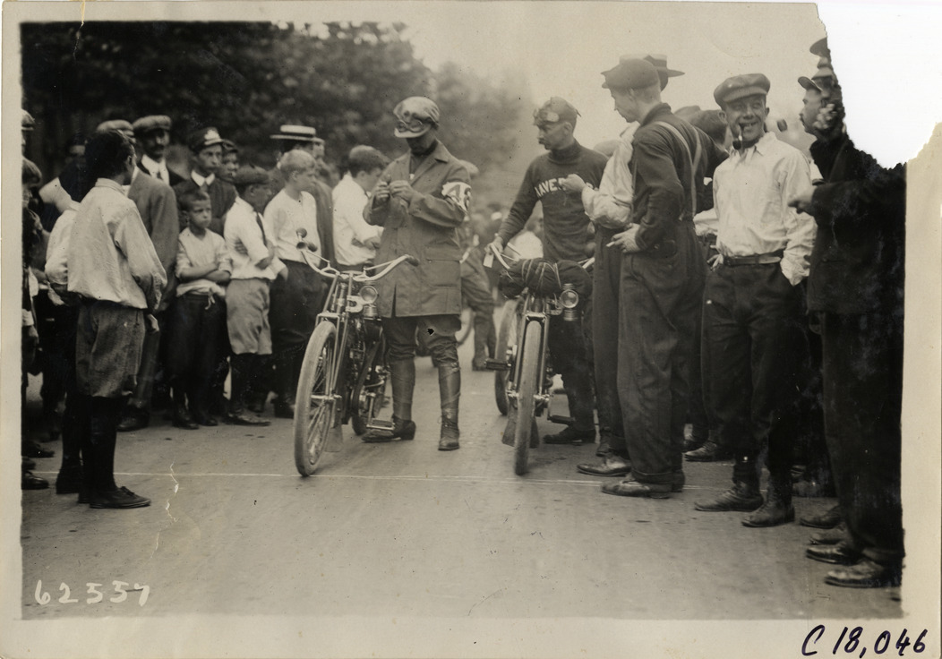 View of motorcyclists standing with motorcycles at starting line during the 1910 endurance and reliability run sponsored by the Federation of American Motorcyclists. Spectators and officials stand on sidelines. Contestants traveled through Pennsylvania, New York and New Jersey. Stamped on back: "Spooner & Wells, Inc., photographers, telephones 3472-3473 Columbus, 1931 Broadway, New York." Handwritten on back: "Tours--Federation of American Motorcyclists Endurance Run, 1910."