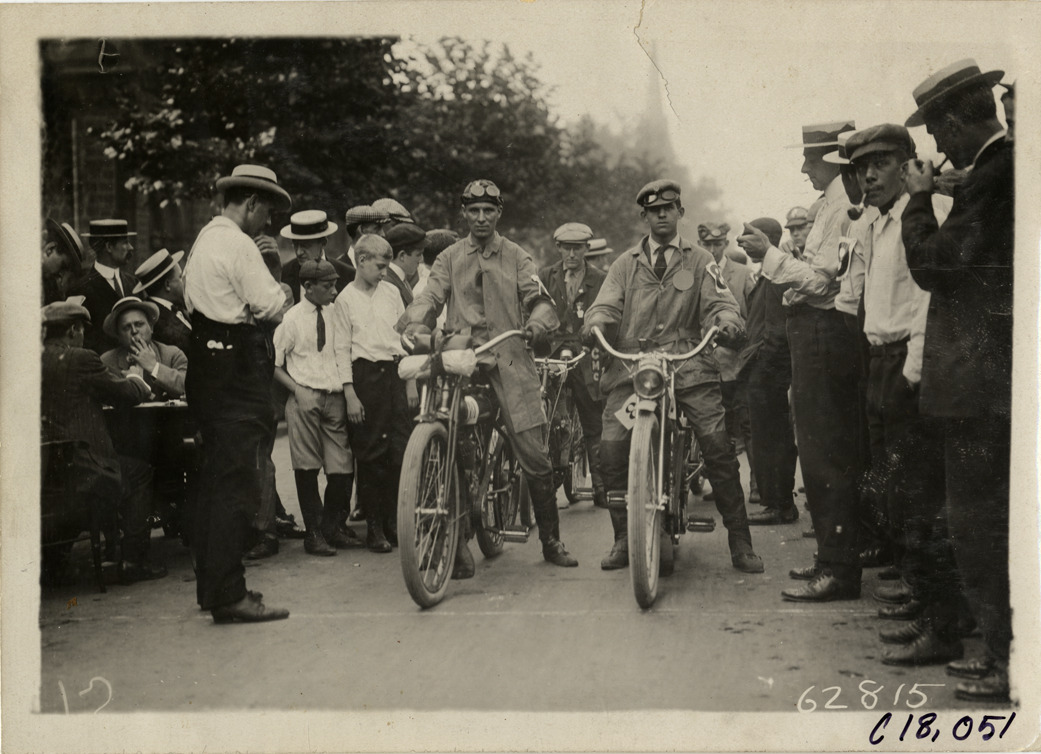 View of motorcyclists standing with motorcycles at starting line during the 1910 endurance and reliability run sponsored by the Federation of American Motorcyclists. Spectators and officials stand on sidelines. Contestants traveled through Pennsylvania, New York and New Jersey. Stamped on back: "Spooner & Wells, Inc., photographers, telephones 3472-3473 Columbus, 1931 Broadway, New York." Handwritten on back: "Tours--Federation of American Motorcyclists Endurance Run, 1910."