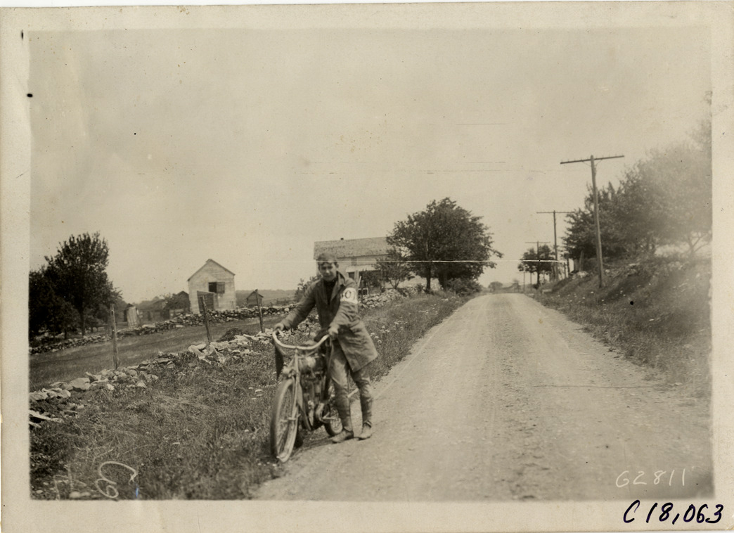 View of man standing next to motorcycle on rural dirt road during the 1910 endurance and reliability run sponsored by the Federation of American Motorcyclists. Contestants traveled through Pennsylvania, New York and New Jersey. Stamped on back: "Spooner & Wells, Inc., photographers, telephones 3472-3473 Columbus, 1931 Broadway, New York." Handwritten on back: "Tours--Federation of American Motorcyclists Endurance Run, 1910."