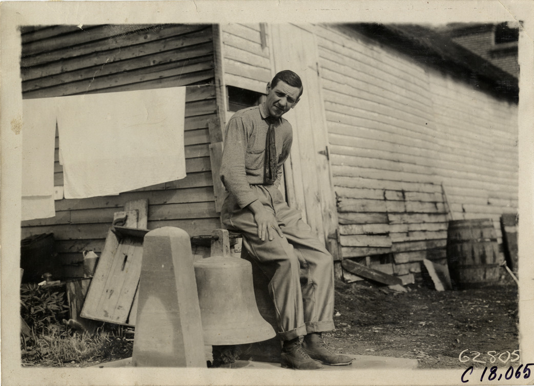 View of man sitting next to bell in front of wooden-frame building during the 1910 endurance and reliability run sponsored by the Federation of American Motorcyclists. Contestants traveled through Pennsylvania, New York and New Jersey. Stamped on back: "Spooner & Wells, Inc., photographers, telephones 3472-3473 Columbus, 1931 Broadway, New York." Handwritten on back: "Tours--Federation of American Motorcyclists Endurance Run, 1910."