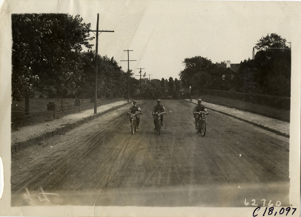 View of three motorcyclists riding motorcycles on dirt road during the 1910 endurance and reliability run sponsored by the Federation of American Motorcyclists. House in background. Contestants traveled through Pennsylvania, New York and New Jersey. Stamped on back: "Spooner & Wells, Inc., photographers, telephones 3472-3473 Columbus, 1931 Broadway, New York." Handwritten on back: "Tours--Federation of American Motorcyclists Endurance Run, 1910."