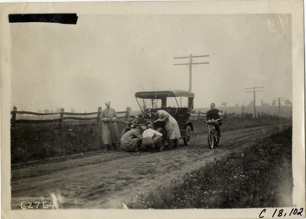 View of man riding motorcycle past car on side of rural dirt road during the 1910 endurance and reliability run sponsored by the Federation of American Motorcyclists. Officials gather around front of car. Contestants traveled through Pennsylvania, New York and New Jersey. Stamped on back: "Spooner & Wells, Inc., photographers, telephones 3472-3473 Columbus, 1931 Broadway, New York." Handwritten on back: "Tours--Federation of American Motorcyclists Endurance Run, 1910."