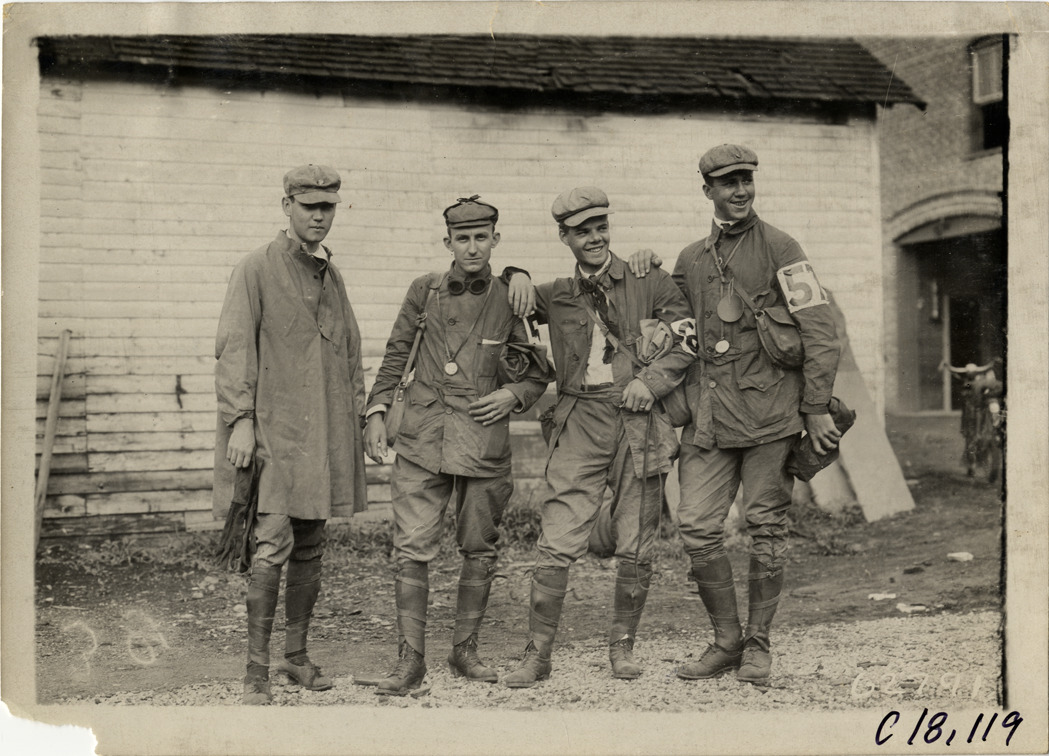 View of four motorcyclists posing in front of wooden-frame building during the 1910 endurance and reliability run sponsored by the Federation of American Motorcyclists. Contestants traveled through Pennsylvania, New York and New Jersey. Stamped on back: "Spooner & Wells, Inc., photographers, telephones 3472-3473 Columbus, 1931 Broadway, New York." Handwritten on back: "Tours--Federation of American Motorcyclists Endurance Run, 1910."
