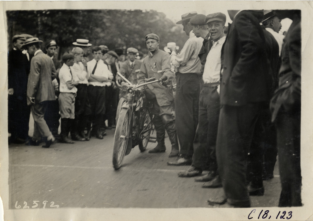 View of motorcyclist standing with motorcycle at starting line during the 1910 endurance and reliability run sponsored by the Federation of American Motorcyclists. Spectators and officials on sidelines. Contestants traveled through Pennsylvania, New York and New Jersey. Stamped on back: "Spooner & Wells, Inc., photographers, telephones 3472-3473 Columbus, 1931 Broadway, New York." Handwritten on back: "Tours--Federation of American Motorcyclists Endurance Run, 1910."