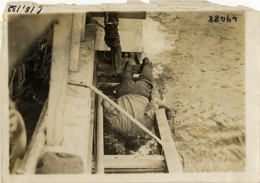 View of man leaning over edge of Cayuga Lake ferry during the 1911 tour sponsored by the Federation of American Motorcyclists. Stamped on back: "Spooner & Wells, Inc., photographers, telephones 3472-3473 Columbus, 1931 Broadway, New York." Handwritten on back: "Tours--Federation of American Motorcyclists Tour, 1911."