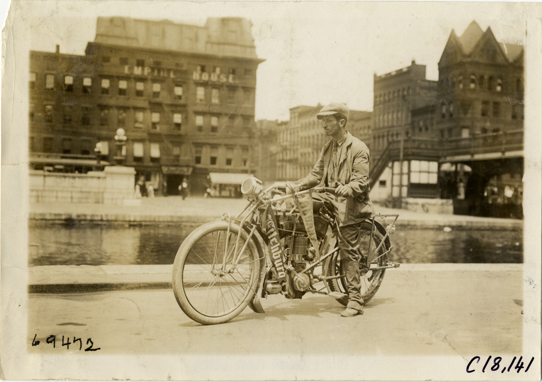 View of man posing on motorcycle decorated with "Albany" and "Fitchburg" flags during the 1911 tour sponsored by the Federation of American Motorcyclists. Canal and buildings in background. Stamped on back: "Spooner & Wells, Inc., photographers, telephones 3472-3473 Columbus, 1931 Broadway, New York." Handwritten on back: "Tours--Federation of American Motorcyclists Tour, 1911."