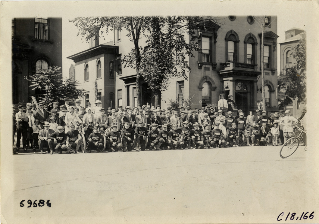 View of Pierce motorcyclists posing with motorcycles in front of Italianate building during the 1911 tour sponsored by the Federation of American Motorcyclists. Men wear "Pierce" jerseys. Stamped on back: "Spooner & Wells, Inc., photographers, telephones 3472-3473 Columbus, 1931 Broadway, New York." Handwritten on back: "Tours--Federation of American Motorcyclists Tour, 1911."