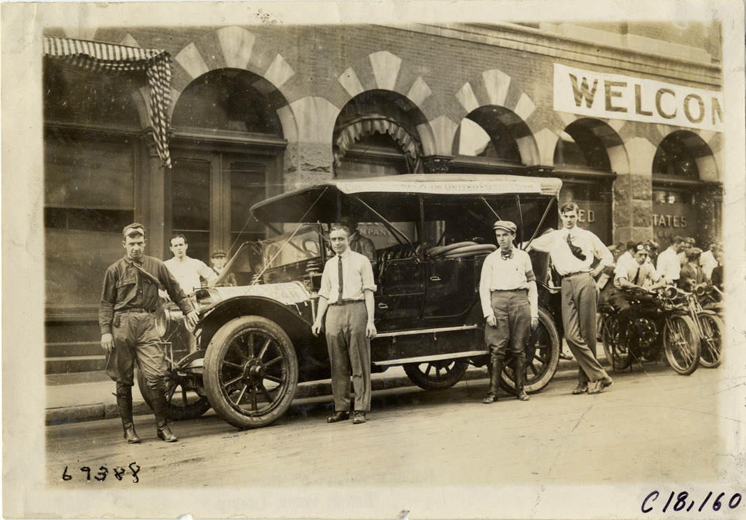 Men posing with automobile in front of United States Tire Company, 1911 Federation of American Motorcyclists Tour