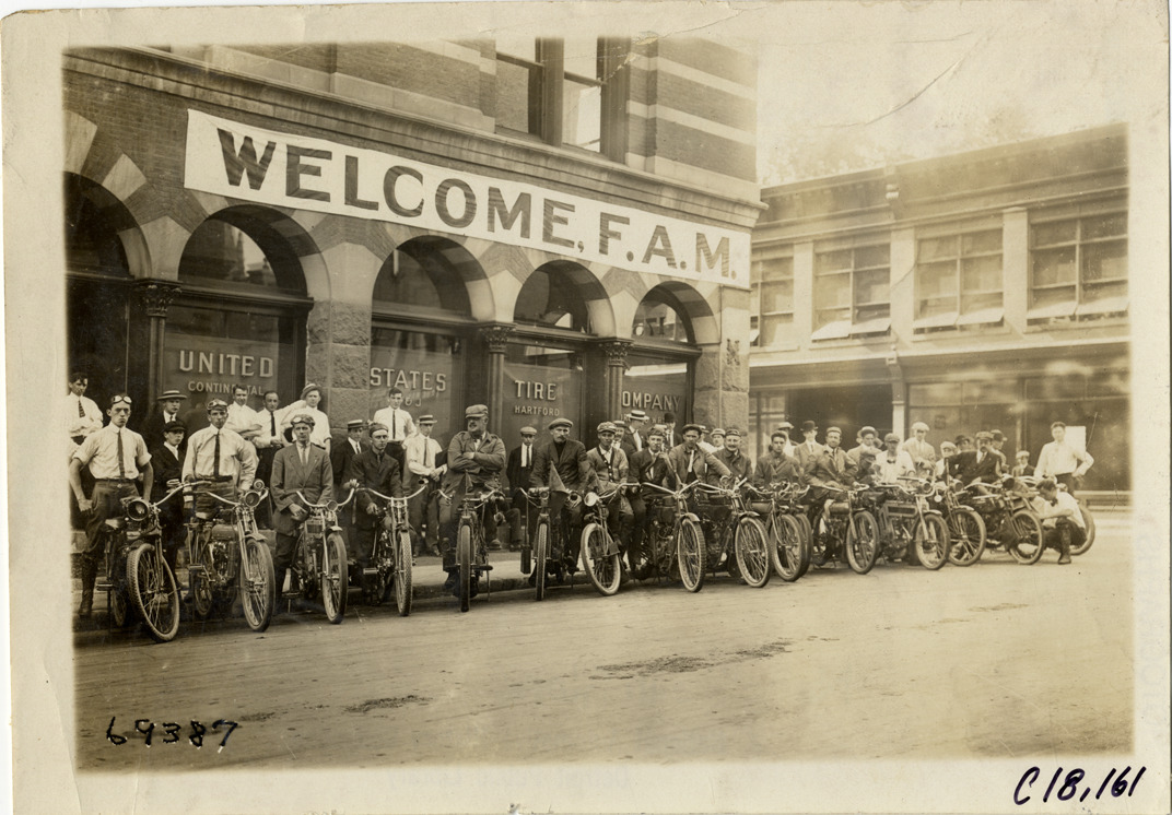 View of motorcyclists posing with motorcycles in front of United States Tire Company building during the 1911 tour sponsored by the Federation of American Motorcyclists. "Welcome F.A.M." banner displayed on building facade. Stamped on back: "Spooner & Wells, Inc., photographers, telephones 3472-3473 Columbus, 1931 Broadway, New York." Handwritten on back: "Tours--Federation of American Motorcyclists Tour, 1911."
