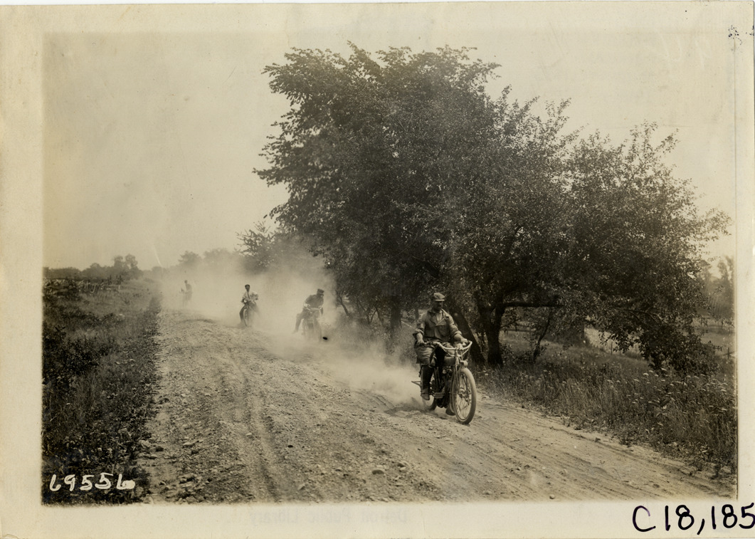 View of men riding motorcycles on rural dirt road during the 1911 tour sponsored by the Federation of American Motorcyclists. Stamped on back: "Spooner & Wells, Inc., photographers, telephones 3472-3473 Columbus, 1931 Broadway, New York." Handwritten on back: "Tours--Federation of American Motorcyclists Tour, 1911."