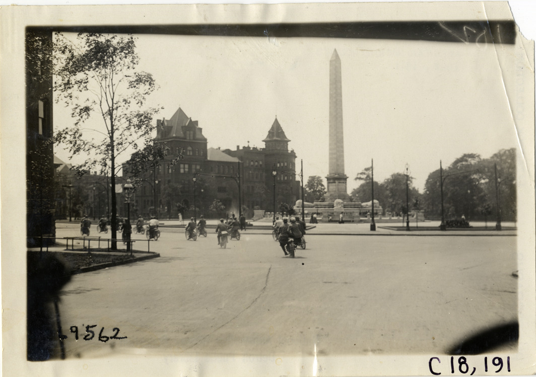 Rear view of motorcyclists riding around William McKinley monument in Buffalo, New York during the 1911 tour sponsored by the Federation of American Motorcyclists. Stamped on back: "Spooner & Wells, Inc., photographers, telephones 3472-3473 Columbus, 1931 Broadway, New York." Handwritten on back: "Tours--Federation of American Motorcyclists Tour, 1911."