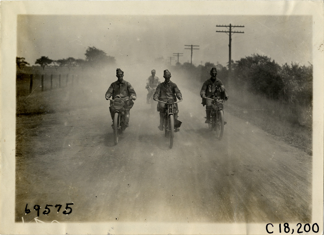 Men riding motorcycles on rural road near Buffalo, New York, 1911 Federation of American Motorcyclists Tour
