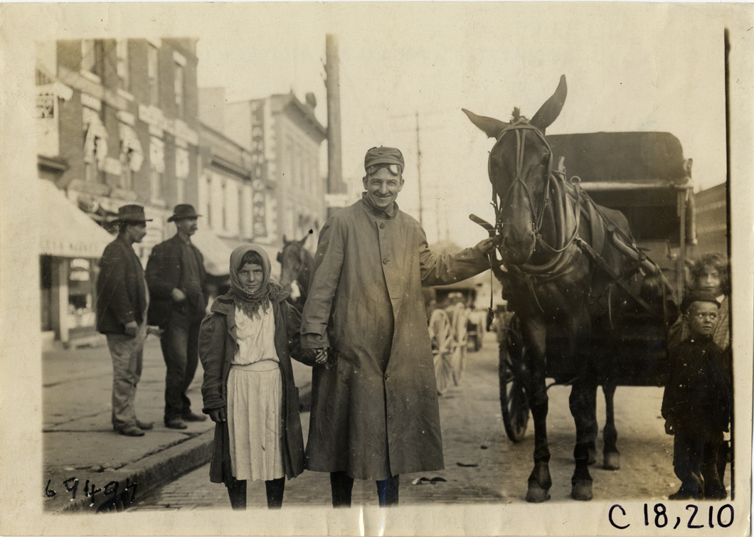View of man, possibly a motorcyclist, holding hands with a young girl and posing with mule-drawn wagon during the 1911 tour sponsored by the Federation of American Motorcyclists. Stamped on back: "Spooner & Wells, Inc., photographers, telephones 3472-3473 Columbus, 1931 Broadway, New York." Handwritten on back: "Tours--Federation of American Motorcyclists Tour, 1911."