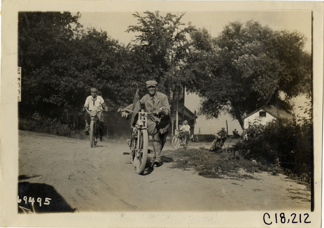 View of men riding motorcycles on rural dirt road during the 1911 tour sponsored by the Federation of American Motorcyclists. Stamped on back: "Spooner & Wells, Inc., photographers, telephones 3472-3473 Columbus, 1931 Broadway, New York." Handwritten on back: "Tours--Federation of American Motorcyclists Tour, 1911."