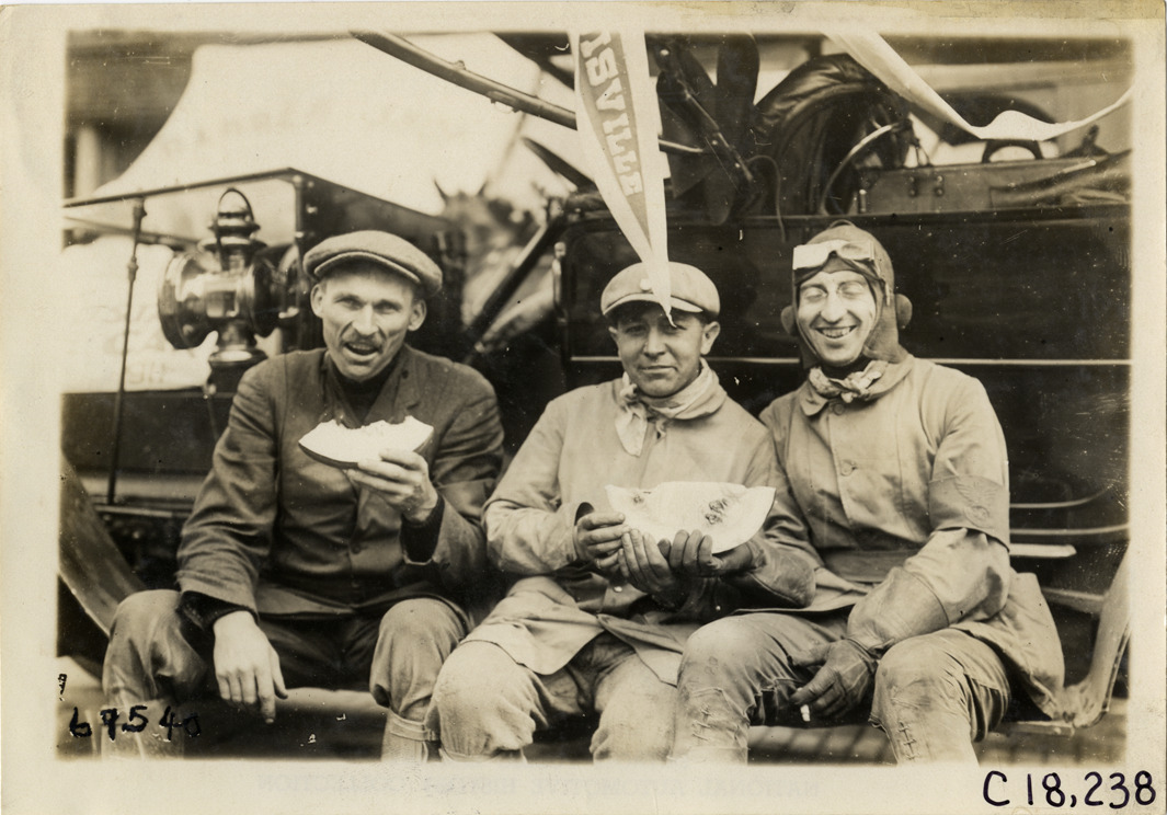 Close-up view of motorcyclists eating watermelon at Batavia, New York during the 1911 tour sponsored by the Federation of American Motorcyclists. Stamped on back: "Spooner & Wells, Inc., photographers, telephones 3472-3473 Columbus, 1931 Broadway, New York." Handwritten on back: "Batavia, N.Y. Tours--Federation of American Motorcyclists Tour, 1911."
