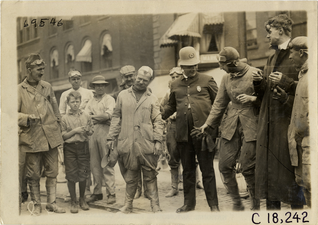 View of motorcyclists clowning with policeman at Batavia, New York during the 1911 tour sponsored by the Federation of American Motorcyclists. Stamped on back: "Spooner & Wells, Inc., photographers, telephones 3472-3473 Columbus, 1931 Broadway, New York." Handwritten on back: "A little comedy with the Police Dept. in Batavia, N.Y. Tours--Federation of American Motorcyclists Tour, 1911."