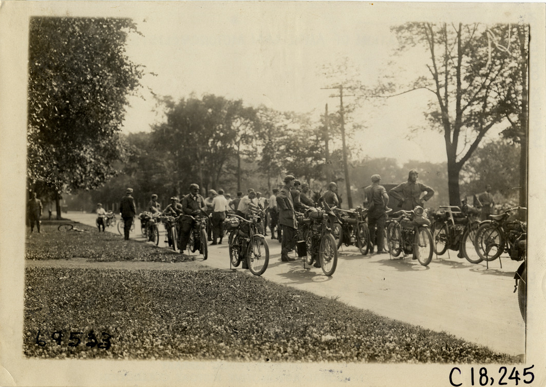 View of motorcyclists with motorcycles in street at Utica, New York during the 1911 tour sponsored by the Federation of American Motorcyclists. Stamped on back: "Spooner & Wells, Inc., photographers, telephones 3472-3473 Columbus, 1931 Broadway, New York." Handwritten on back: "Utica, N.Y. Tours--Federation of American Motorcyclists Tour, 1911."