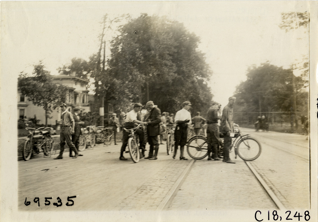 Motorcyclists with motorcycles in street at Utica, New York, 1911 Federation of American Motorcyclists Tour