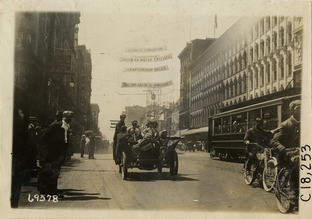 View of motorists traveling in Diamond Tires car on street behind motorcyclists during the 1911 tour sponsored by the Federation of American Motorcyclists. Commercial buildings line street; streetcar in background. "Annual convention, Federation of American Motorcyclists, championship races" banner is suspended over street. Stamped on back: "Spooner & Wells, Inc., photographers, telephones 3472-3473 Columbus, 1931 Broadway, New York." Handwritten on back: "Tours--Federation of American Motorcyclists Tour, 1911."