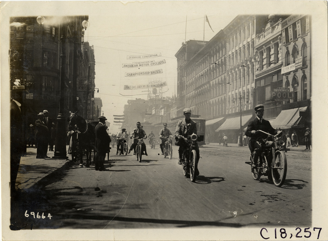 View of motorcyclists traveling on commercial street during the 1911 tour sponsored by the Federation of American Motorcyclists. Streetcar in background. "Annual convention, Federation of American Motorcyclists, championship races" banner is suspended over street. Stamped on back: "Spooner & Wells, Inc., photographers, telephones 3472-3473 Columbus, 1931 Broadway, New York." Handwritten on back: "Tours--Federation of American Motorcyclists Tour, 1911."