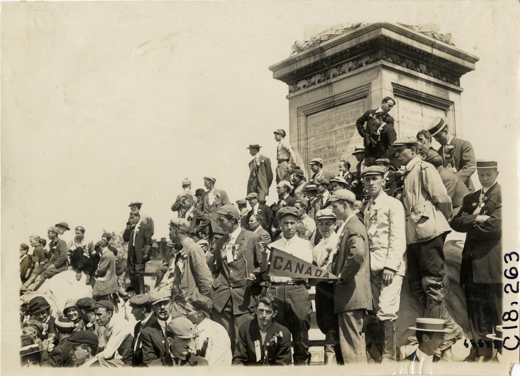 Close-up view of motorcyclists posing in front of William McKinley monument in Buffalo, New York during the 1911 tour sponsored by the Federation of American Motorcyclists. One man holds "Canada" pennant. Stamped on back: "Spooner & Wells, Inc., photographers, telephones 3472-3473 Columbus, 1931 Broadway, New York." Handwritten on back: "Tours--Federation of American Motorcyclists Tour, 1911."