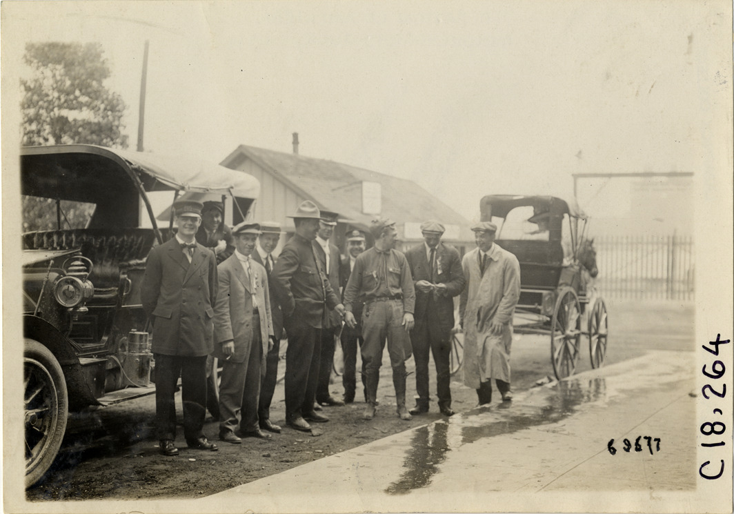 View of group of men posing in street between car and horse-drawn carriage during the 1911 tour sponsored by the Federation of American Motorcyclists. Stamped on back: "Spooner & Wells, Inc., photographers, telephones 3472-3473 Columbus, 1931 Broadway, New York." Handwritten on back: "Tours--Federation of American Motorcyclists Tour, 1911."