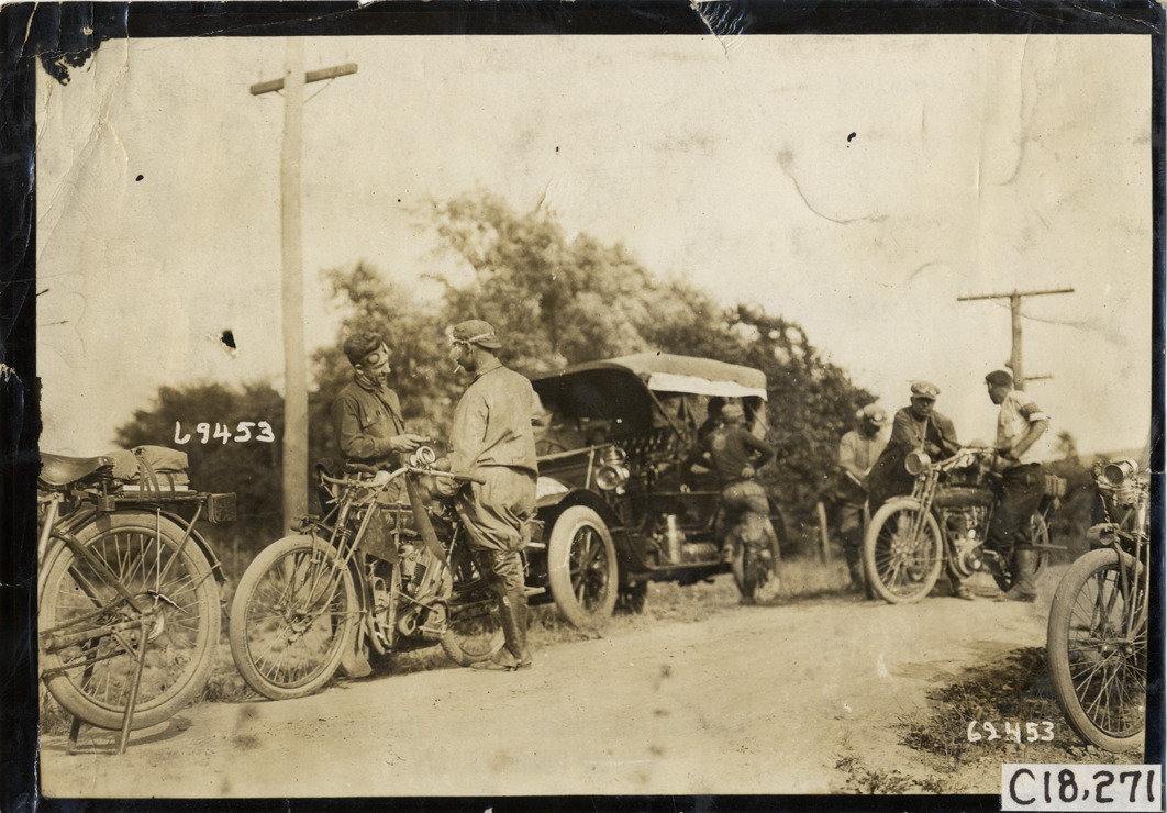 Motorcyclists resting on roadside near Albany, New York, 1911 Federation of American Motorcyclists Tour
