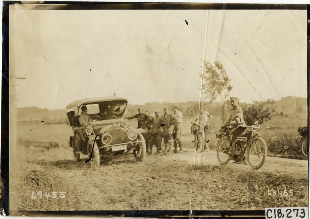View of motorcyclists resting on roadside with motorcycles during the 1911 tour sponsored by the Federation of American Motorcyclists. Car on left. Stamped on back: "Spooner & Wells, Inc., photographers, telephones 3472-3473 Columbus, 1931 Broadway, New York." Handwritten on back: "Tours--Federation of American Motorcyclists Tour, 1911."