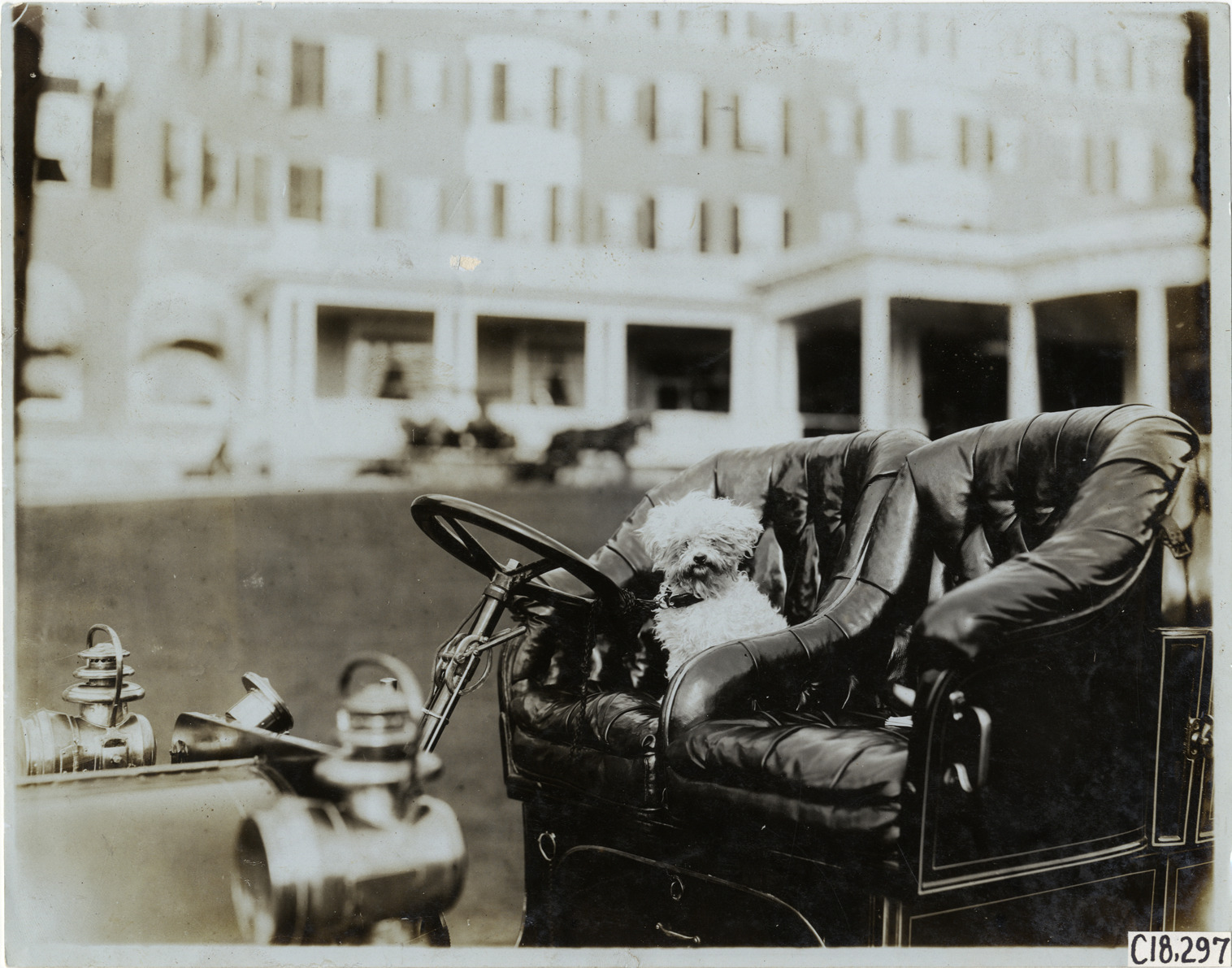 View of dog sitting in driver's seat of car during the 1905 Glidden Tour. Stamped on back: "Photo by F. Ed. Spooner, 1536 B'way, telephone 6536-38th St., New York, N.Y." Handwritten on back: "Tours--Glidden Tour, 1905."