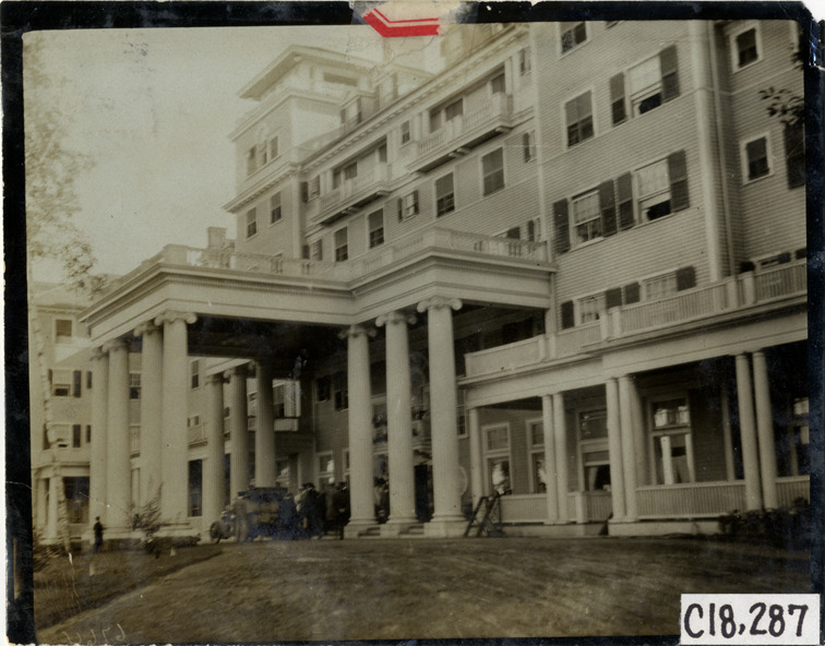 Automobile parked in front of hotel, 1905 Glidden Tour