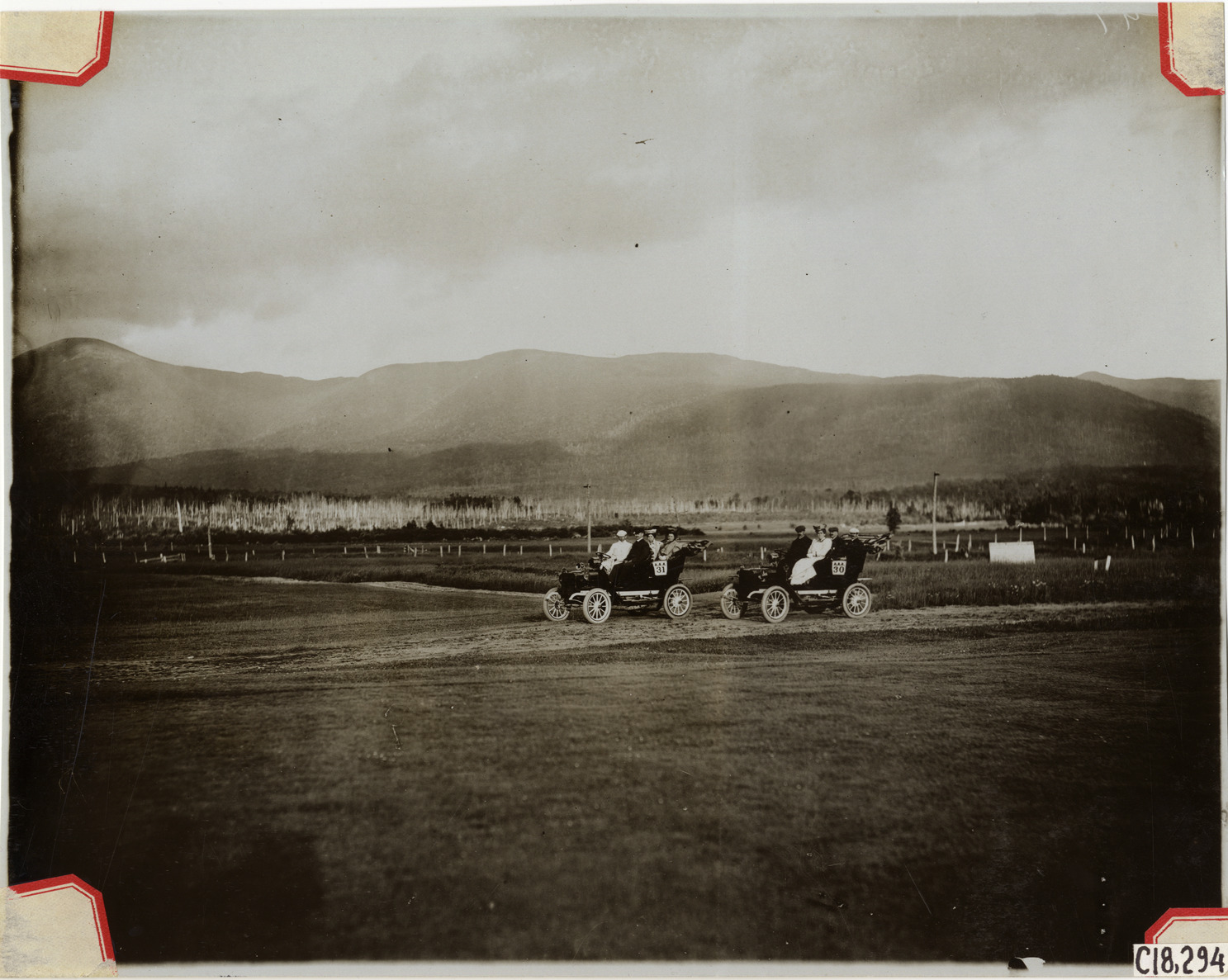 View of R.E. Olds and passengers in Reo car no. 30 and R.M. Owen and passengers in Reo car no. 31 during the 1905 Glidden Tour. Stamped on back: "Photo by F. Ed. Spooner, 1536 B'way, telephone 6536-38th St., New York, N.Y." Handwritten on back: "#30, 16 h.p. Reo, R.E. Olds; #31, 16 h.p. Reo, R.M. Owen. Tours--Glidden Tour, 1905."