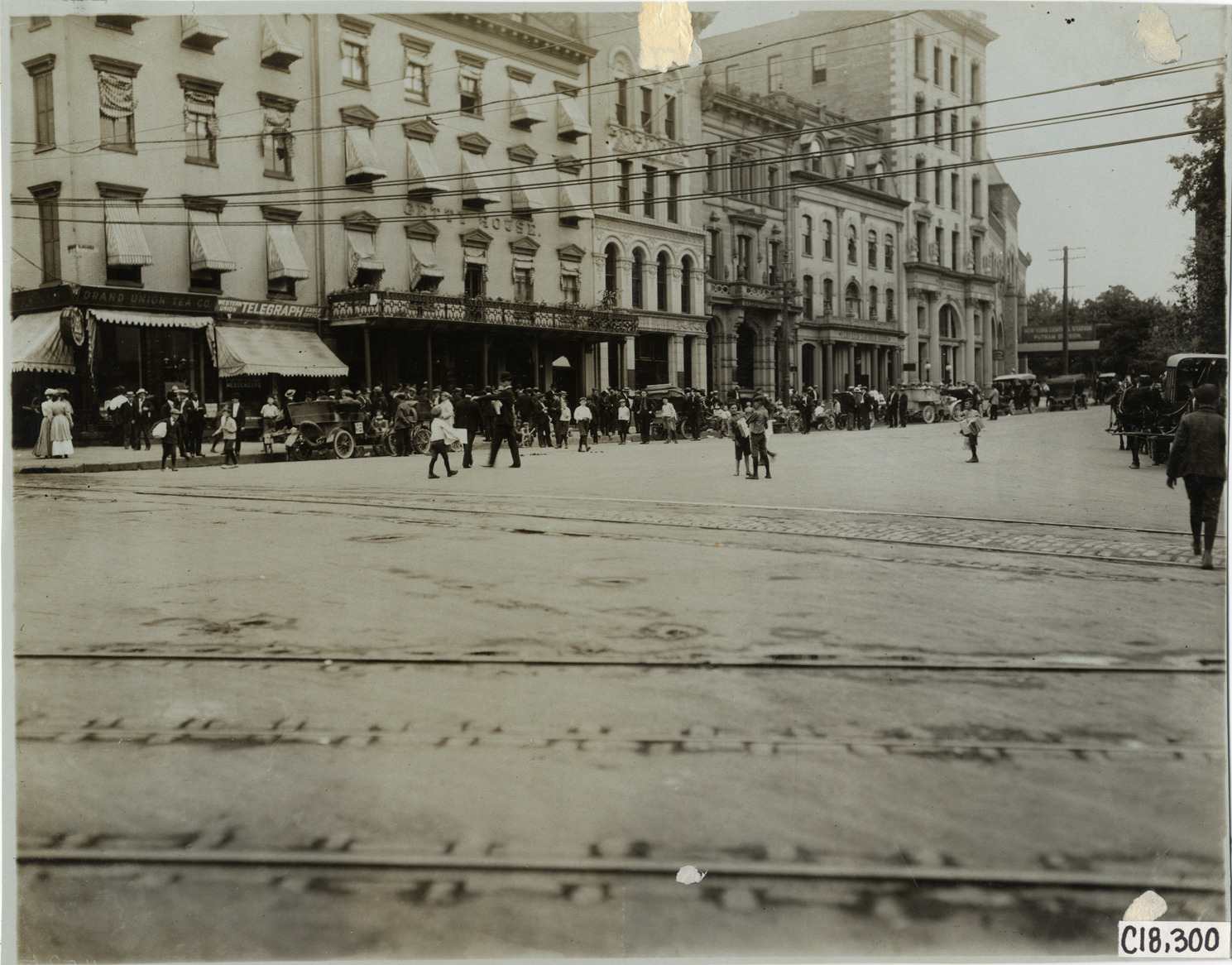 View of motorists in cars lined up in street in front of Getty House and other commercial buildings during the 1905 Glidden Tour. Stamped on back: "Photo by F. Ed. Spooner, 1536 B'way, telephone 6536-38th St., New York, N.Y." Handwritten on back: "Tours--Glidden Tour, 1905."