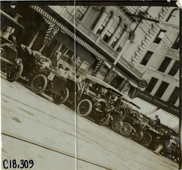 View of cars lined up in front of building during the 1905 Glidden Tour. Stamped on back: "Photo by F. Ed. Spooner, 1536 B'way, telephone 6536-38th St., New York, N.Y." Handwritten on back: "Tours--Glidden Tour, 1905."