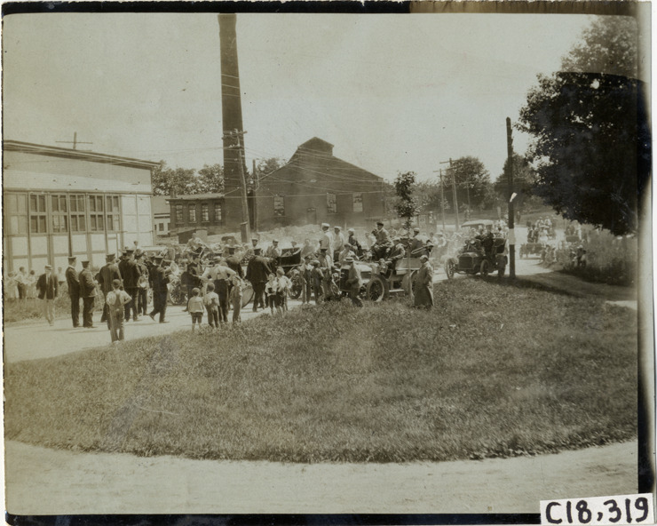 View of Worcester Brass Band, cars and motorists in front of factory at Leicester, Massachusetts during the 1905 Glidden Tour. Stamped on back: "Photo by F. Ed. Spooner, 1536 B'way, telephone 6536-38th St., New York, N.Y." Handwritten on back: "Tours--Glidden Tour, 1905."