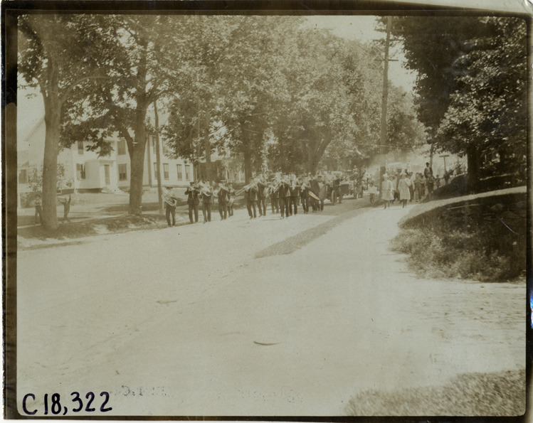 View of brass band marching on tree-lined street at Leicester, Massachusetts, followed by cars, during the 1905 Glidden Tour. Stamped on back: "Photo by F. Ed. Spooner, 1536 B'way, telephone 6536-38th St., New York, N.Y." Handwritten on back: "Tours--Glidden Tour, 1905."