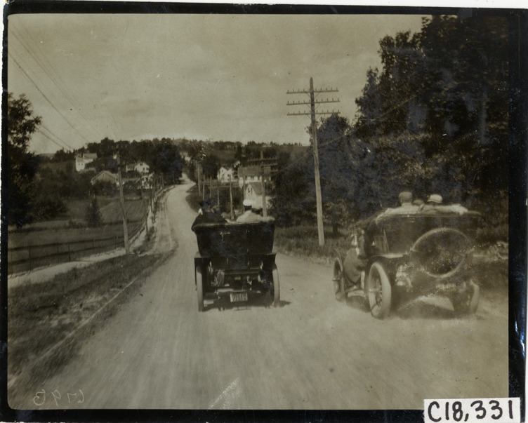Rear view of cars traveling on rural dirt road during the 1905 Glidden Tour. Stamped on back: "Photo by F. Ed. Spooner, 1536 B'way, telephone 6536-38th St., New York, N.Y." Handwritten on back: "Tours--Glidden Tour, 1905."