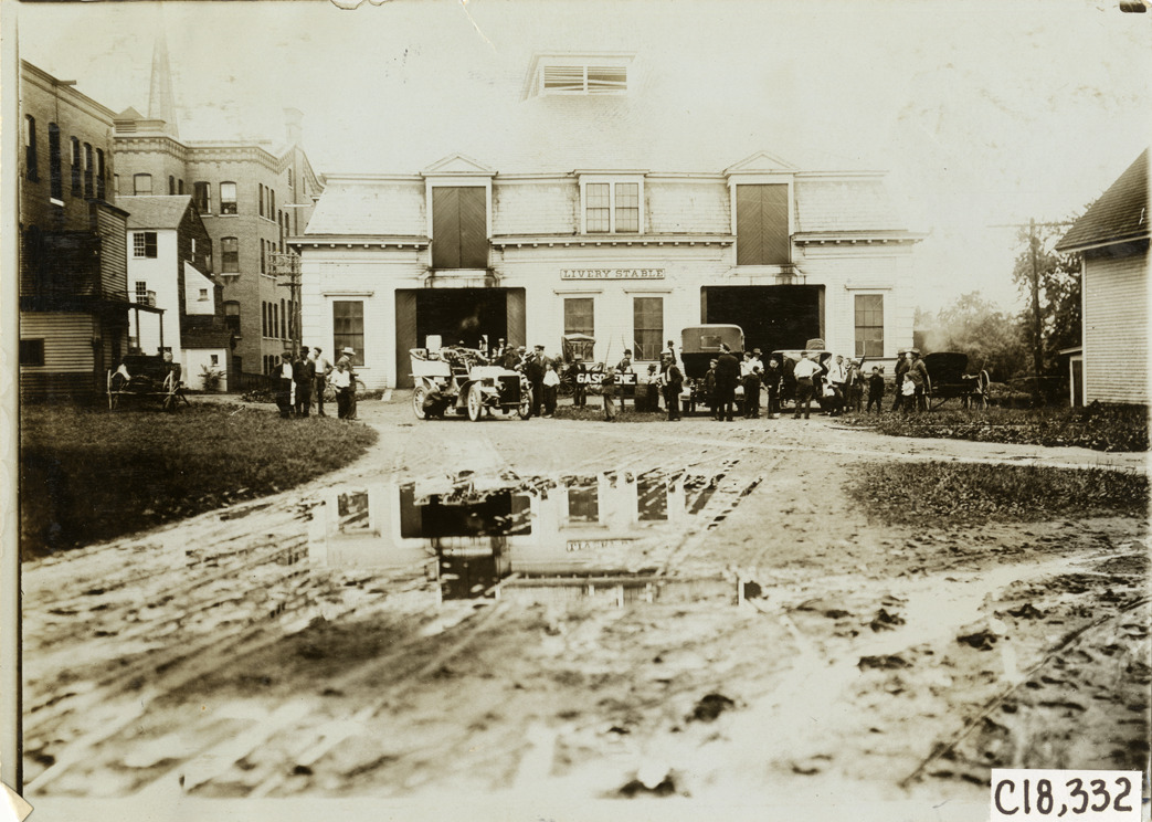 View of motorists with cars in front of livery stable during the 1905 Glidden Tour. Standing water in road in foreground. Stamped on back: "Photo by F. Ed. Spooner, 1536 B'way, telephone 6536-38th St., New York, N.Y." Handwritten on back: "Tours--Glidden Tour, 1905."