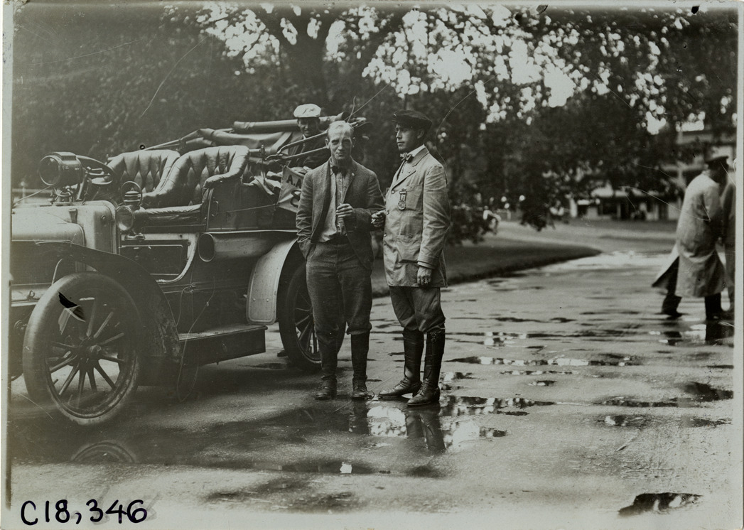 View of two men standing next to car during the 1905 Glidden Tour. Stamped on back: "F. Ed. Spooner, and Chas. S. Wells. Motor News, Motor Photos, Motor Adv, 1536 B'way, New York. Tel 6536-38th St." Handwritten on back: "Tours--Glidden Tour, 1905."