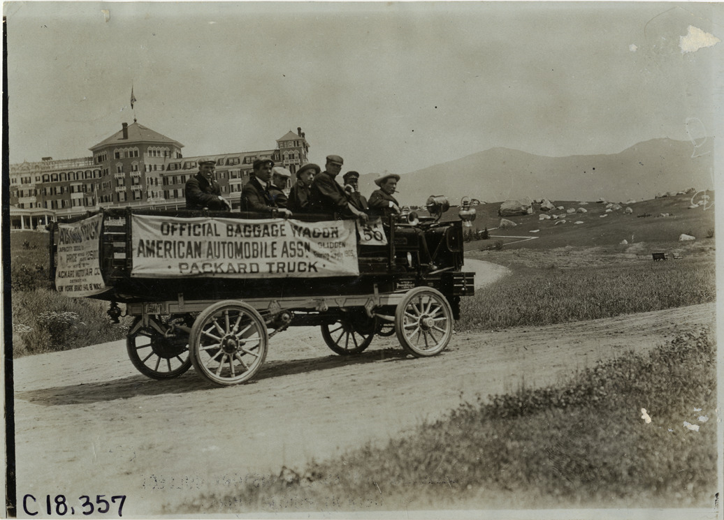 View of driver and passenger in Packard baggage wagon at Bretton Woods, New Hampshire during the 1905 Glidden Tour. Banner displayed on side of truck reads: "Official baggage wagon, American Automobile Assn., Packard truck." Mount Washington Hotel in background. Stamped on back: "Photo by F. Ed. Spooner, 1536 B'way, telephone 6536-38th St., New York, N.Y." Handwritten on back: "#50 Packard baggage wagon. Tours--Glidden Tour, 1905."