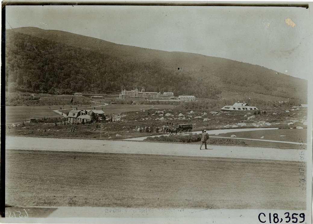 Distant view of Mount Washington Hotel in Bretton Woods, New Hampshire during the 1905 Glidden Tour. Pedestrian and horse-drawn carriage in foreground. Stamped on back: "Photo by F. Ed. Spooner, 1536 B'way, telephone 6536-38th St., New York, N.Y." Handwritten on back: "Tours--Glidden Tour, 1905."
