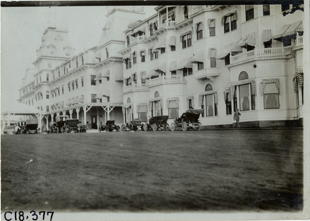 View of cars parked in front of hotel during the 1905 Glidden Tour. Stamped on back: "Photo by F. Ed. Spooner, 1536 B'way, telephone 6536-38th St., New York, N.Y." Handwritten on back: "Tours--Glidden Tour, 1905."
