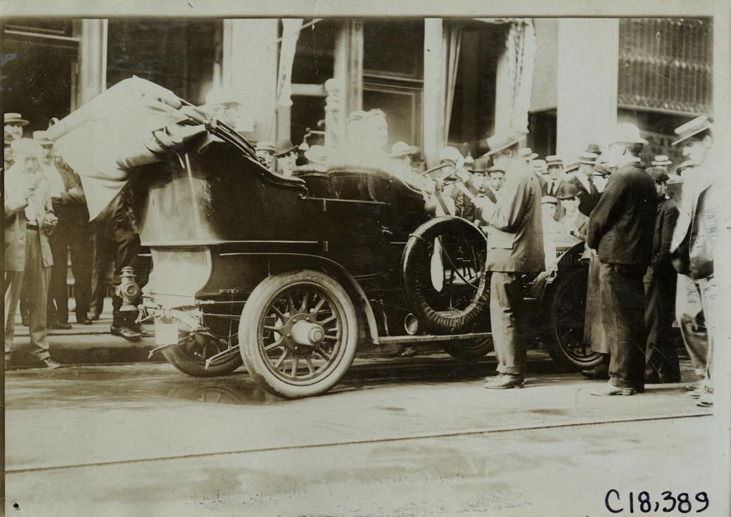 View of man, holding a clipboard, standing next to car during the 1905 Glidden Tour. Spectators in background. Stamped on back: "Photo by F. Ed. Spooner, 1536 B'way, telephone 6536-38th St., New York, N.Y." Handwritten on back: "Tours--Glidden Tour, 1905."