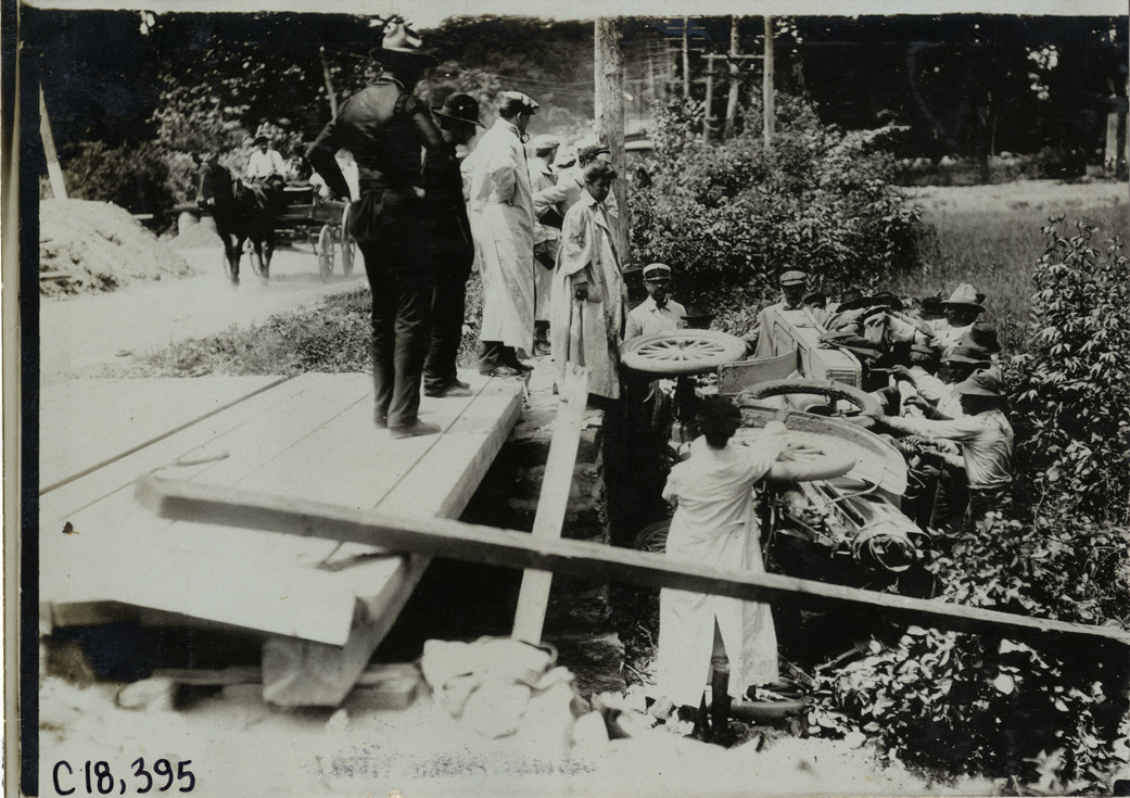 View of wreck of White Steamer car, driven by Joan Cuneo, during the 1905 Glidden Tour. Men surround car in ditch next to wooden bridge; other men stand on bridge. Horse-drawn wagon in background. Stamped on back: "Photo by F. Ed. Spooner, 1536 B'way, telephone 6536-38th St., New York, N.Y." Handwritten on back: "Wreck of Mrs. Cuneo's White Steamer. Tours--Glidden Tour, 1905."