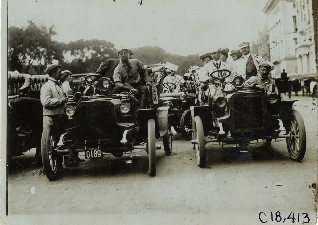 Motorists in Reo automobiles lined up in street, 1905 Glidden Tour